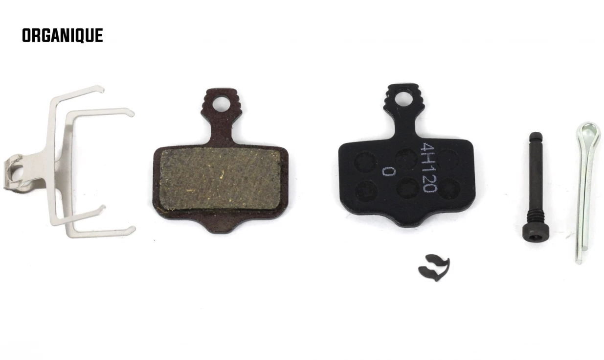 – Les plaquettes organiques (résine servant de liant à un faible taux de métaux) possèdent un freinage puissant, un rodage très rapide mais une longévité plutôt courte. Elles sont vulnérables aux fortes montées en températures (longues descentes) et sont donc à privilégier pour les temps sec et parcours plats ou vallonnés.